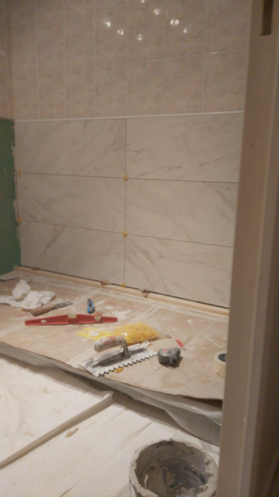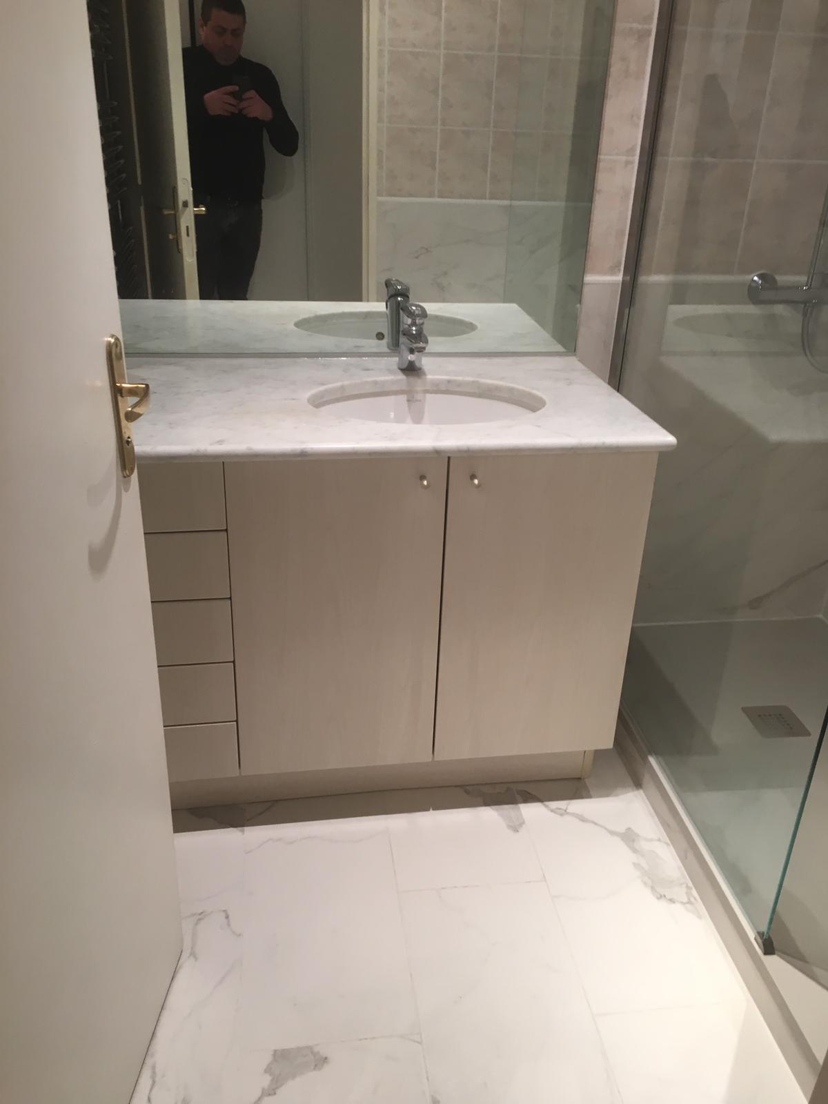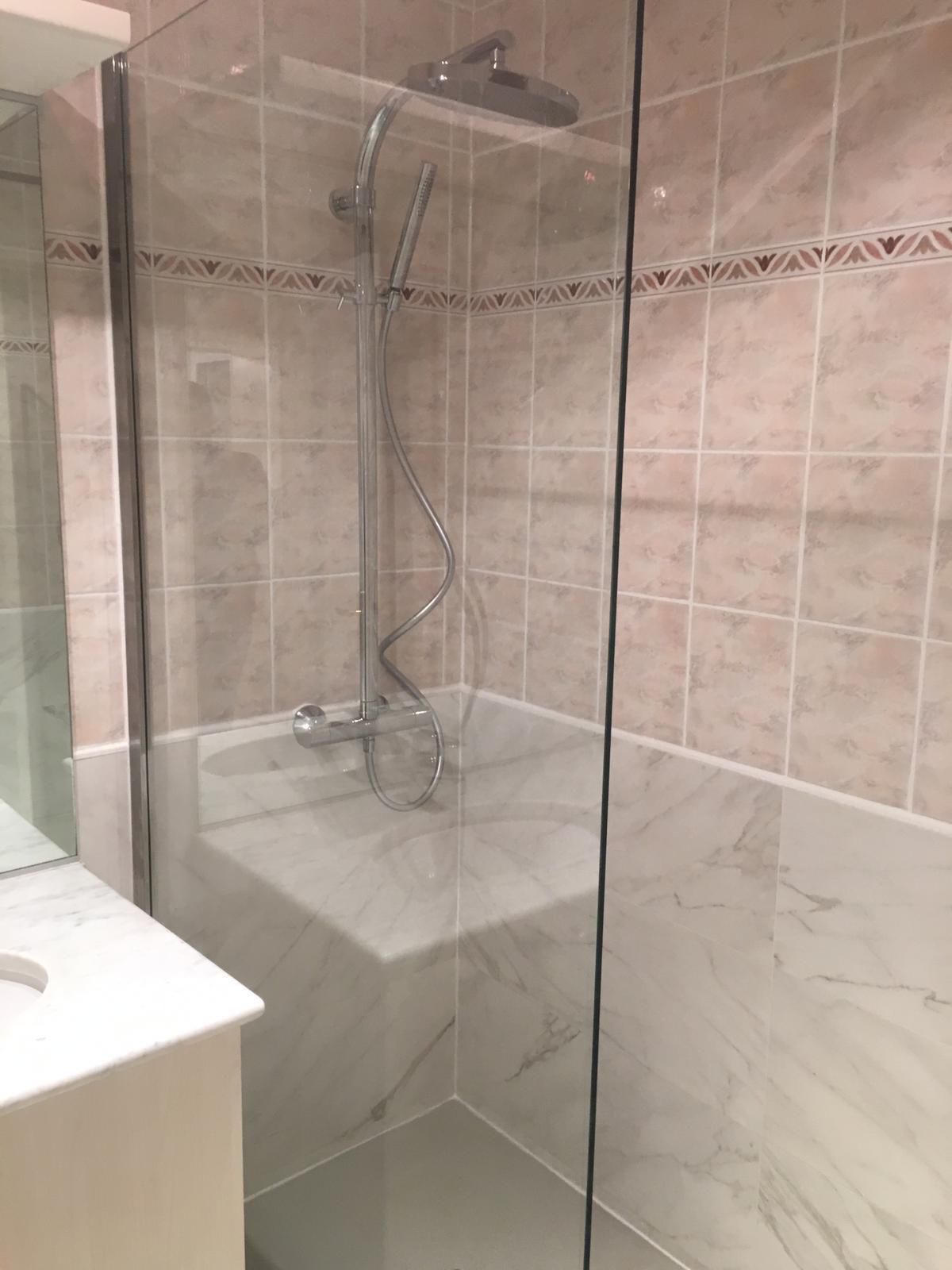 Rénovation de Salle de Bains en convervant certains éléments existant. Remplacement d'un baignoire par une douche à l'italienne. Refonte compète de la plomberie EC/EF et évacuations douche et lavabo. Dépose/pose du carrelage mural partiel à 80 cm. Dépose et pose carrelage / marbre au sol. Posçage et renovation du plan vasque en marbre.