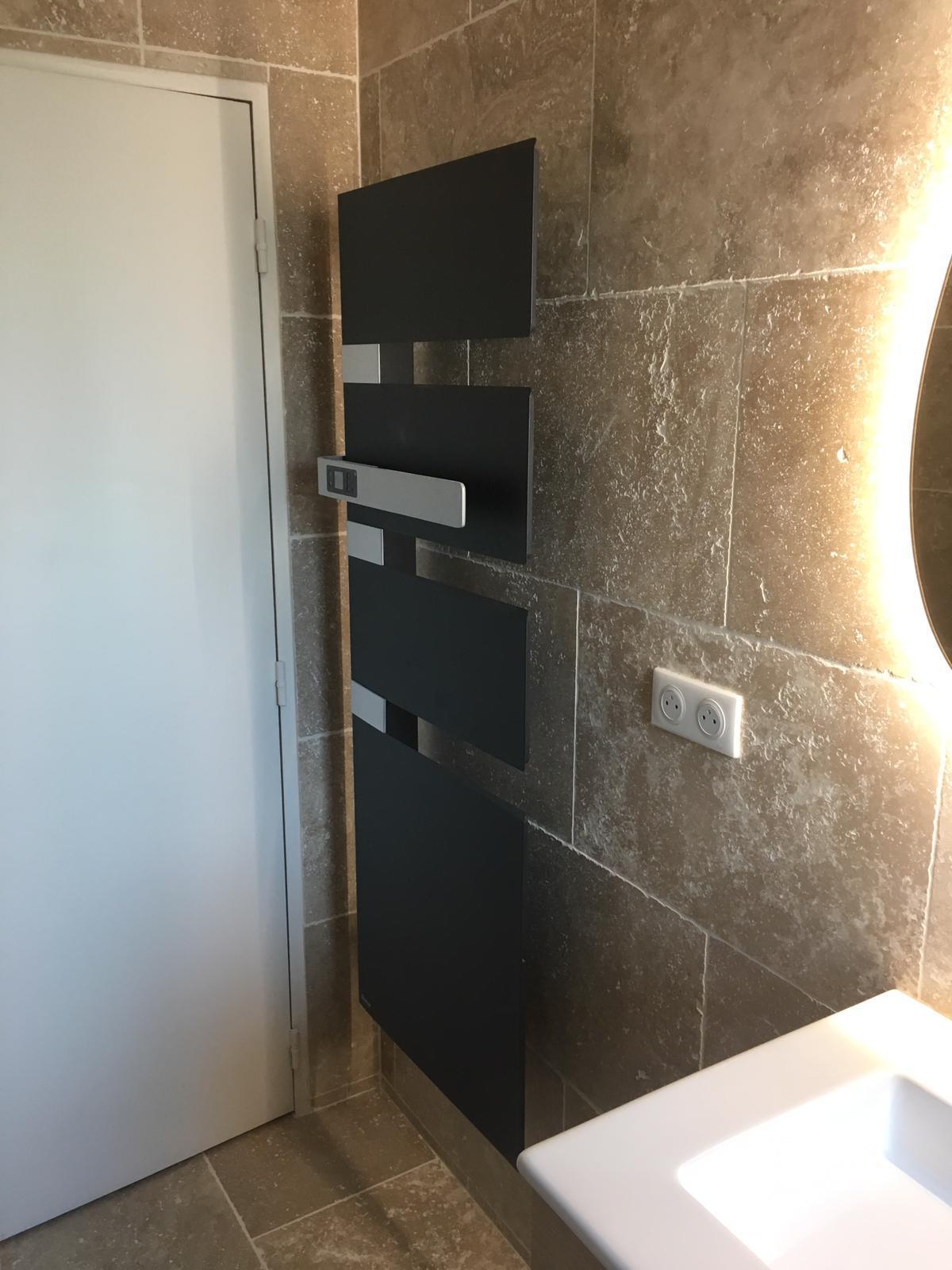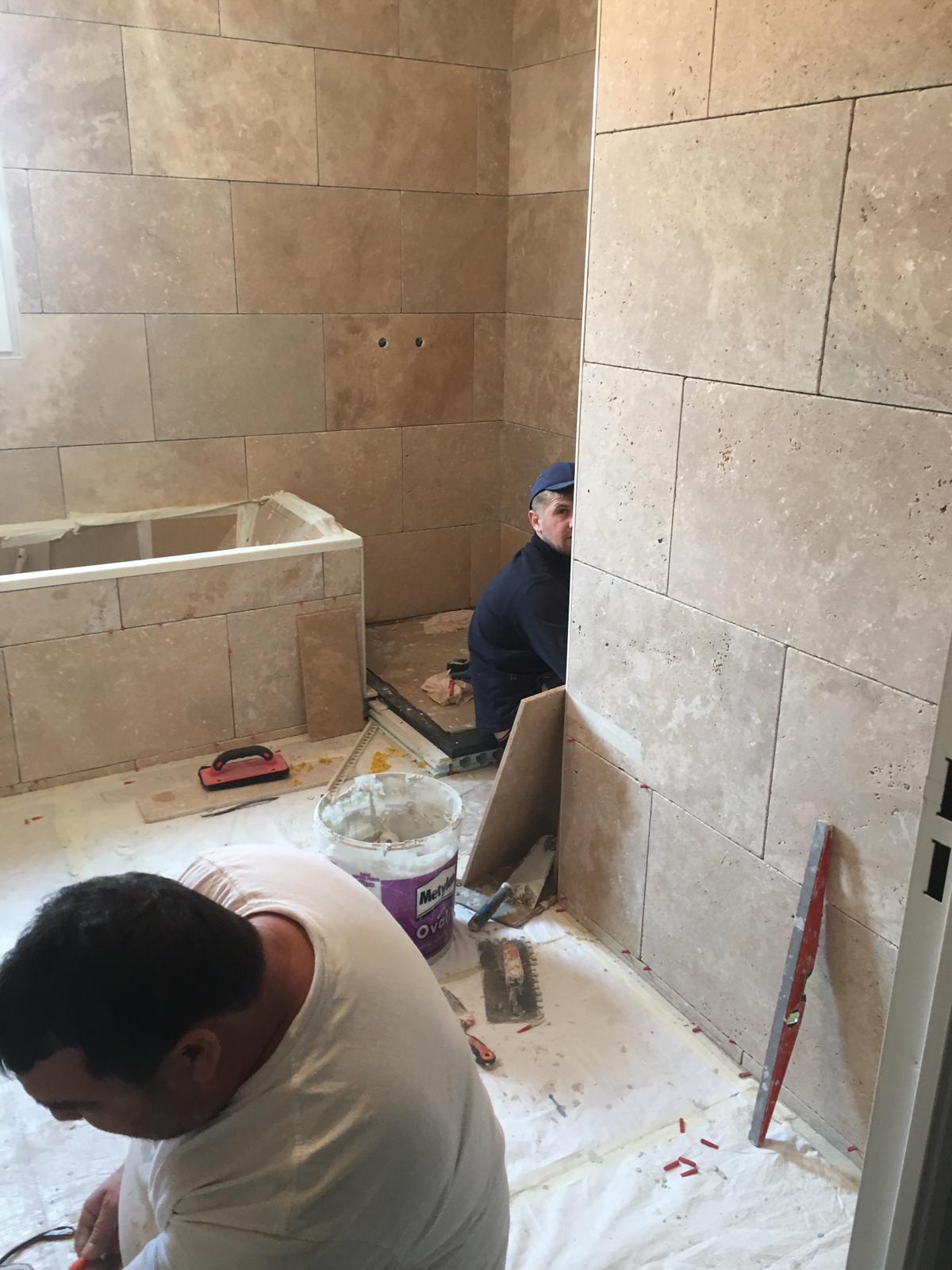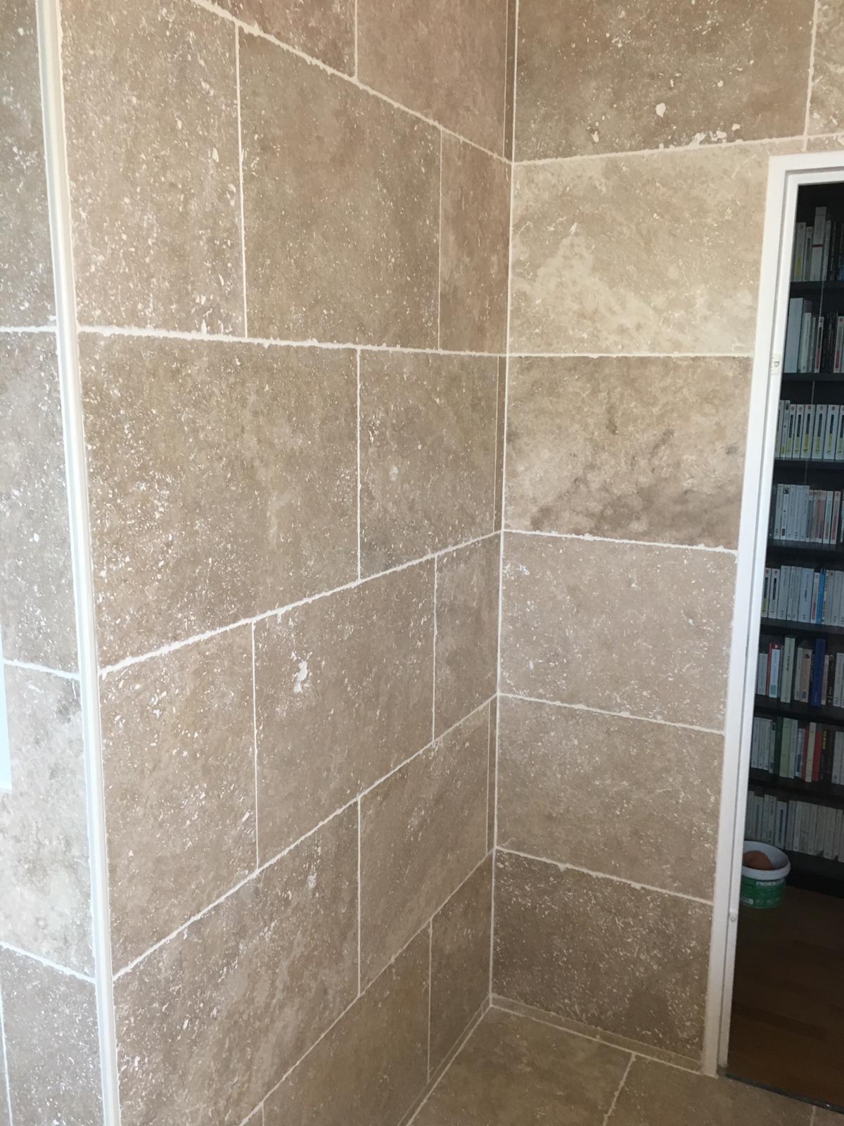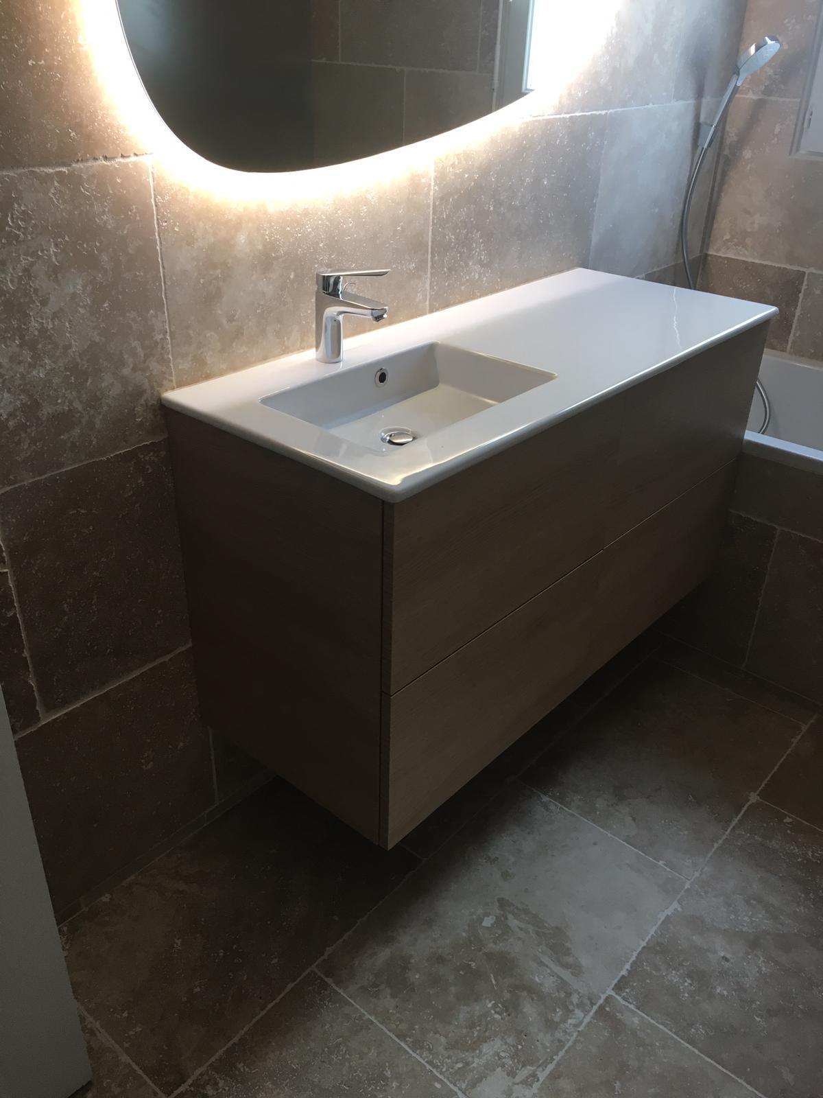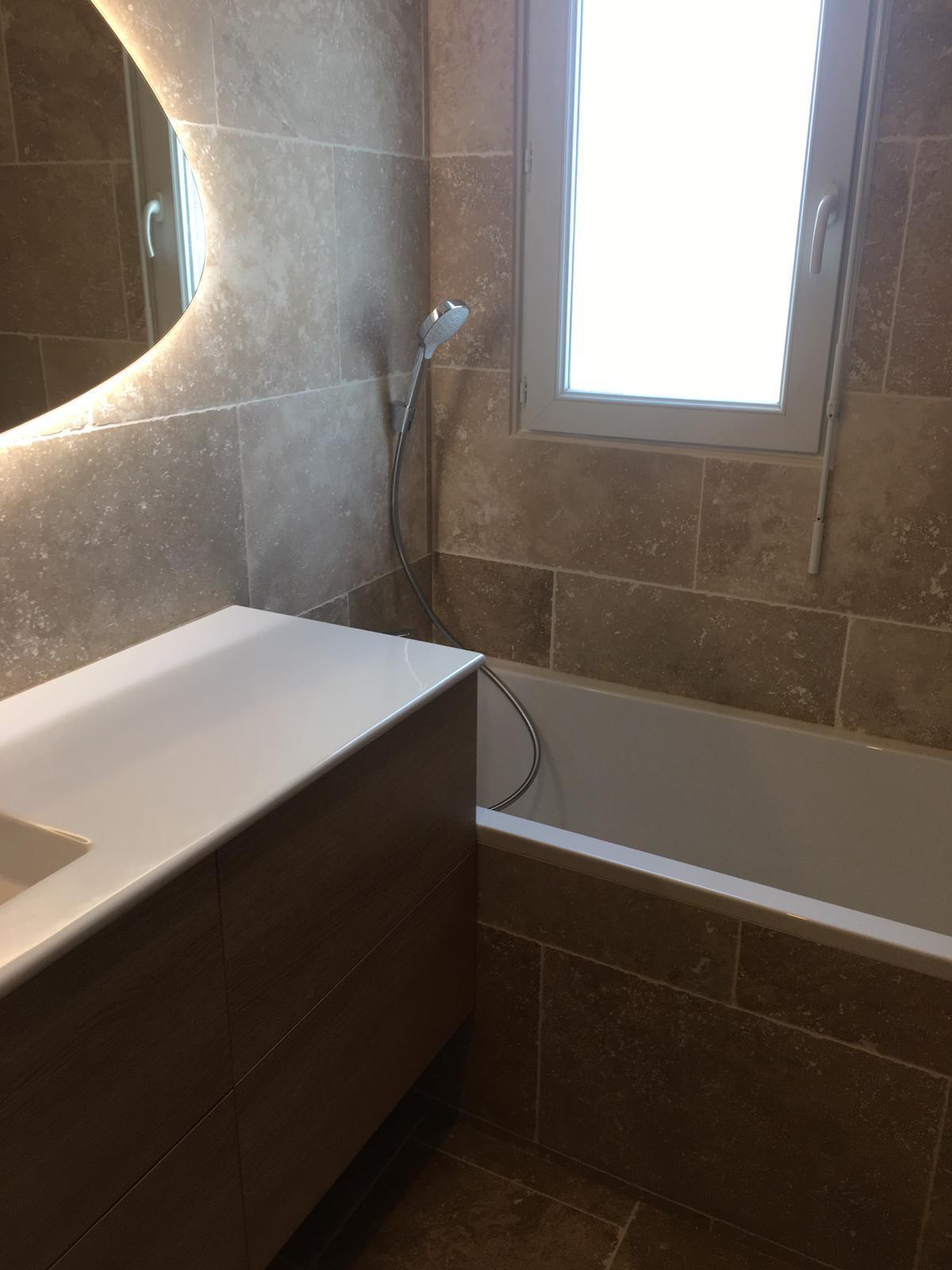 Rénovation complete de Salle de Bains 20m2 comprenant baignoire et douche. Pose meubles BURGAD, pose travertains. #LeroyMerlin